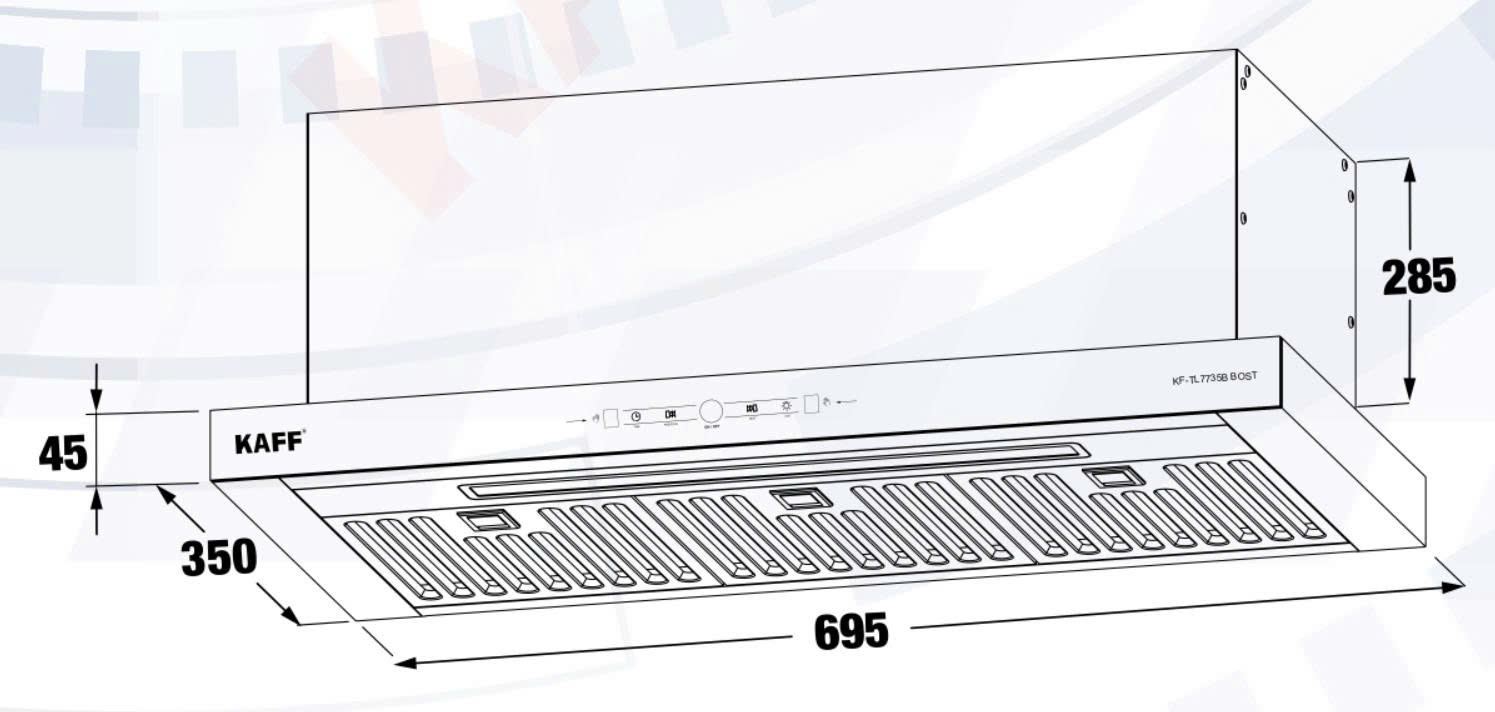 Máy hút mùi Kaff KF-TL7735S BOST. Ảnh kích thước sản phẩm
